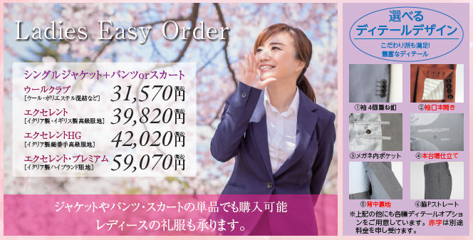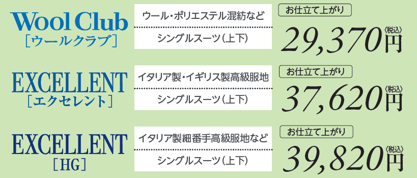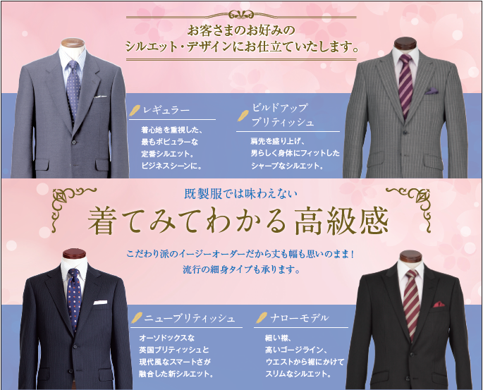 - 追加料金でダブルスーツやスリーピースもお仕立ていただけます。